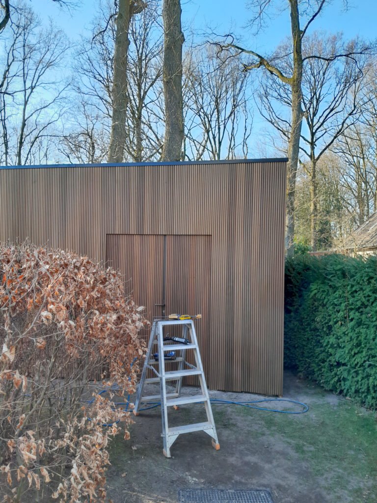 Welke houtafwerking geeft een moderne toets aan een bijgebouw?
