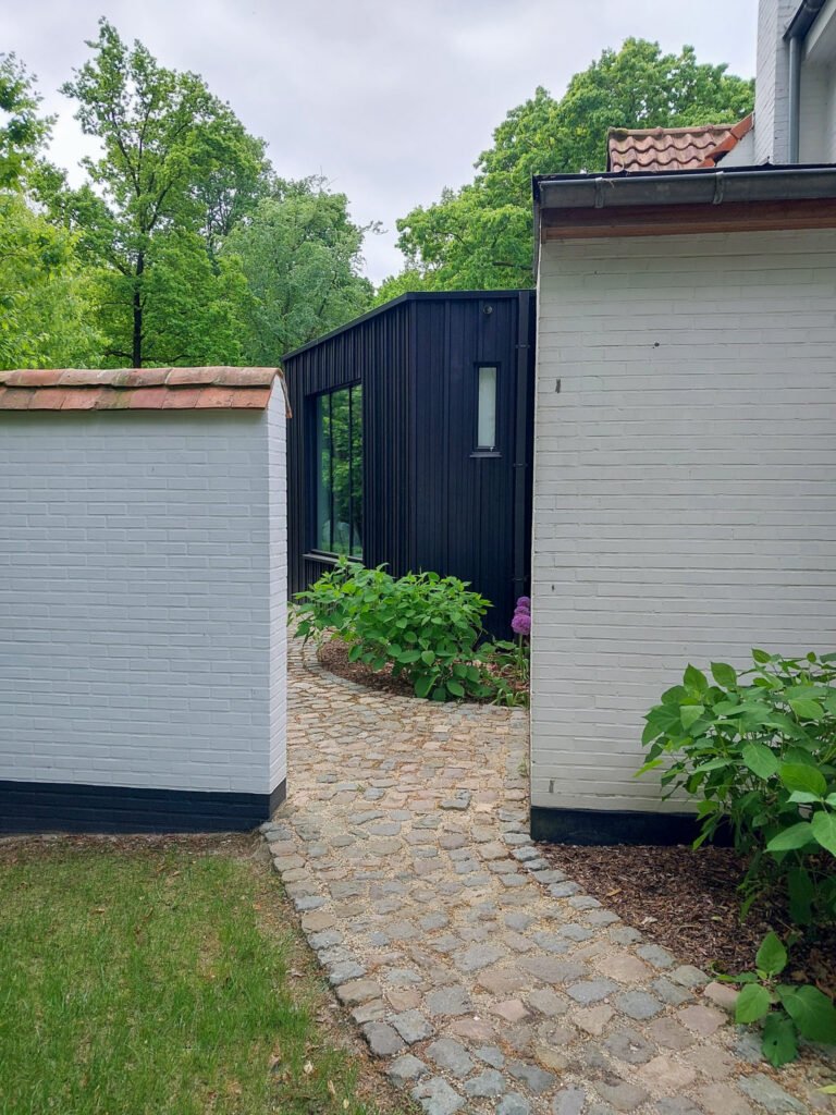 Met z’n verticale belijning en donkere tint vormt hij een stijlvol contrast met het wit van de originele gevel, zonder schril te ogen.